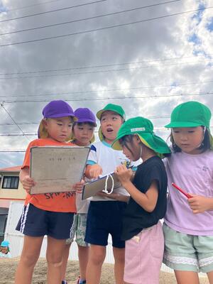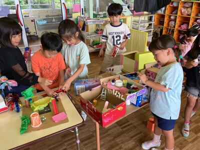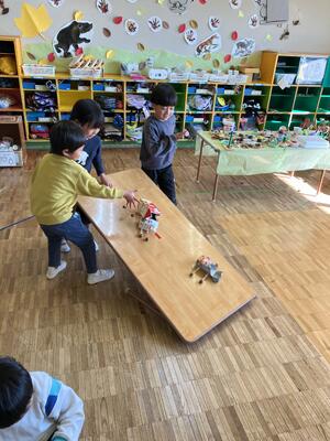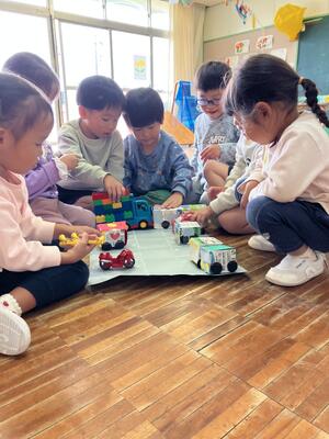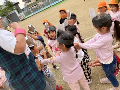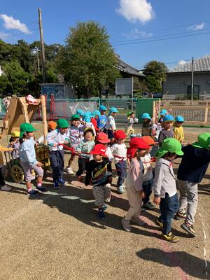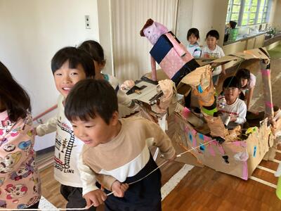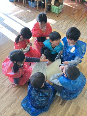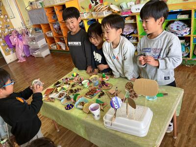 11月のある日、園長先生から「運動会を大成功させた年長さんにお願いがあるんだ。」と話がありました。 「今度若鷺会という方たちが園に来てくれて、みんなと遊んでくれるんだ。その方たちを『おもてなし』」したいって考えているんだ。」 それを聞き、「やりたい!」と、目を輝かせる子どもたちの姿がありました。 おもてなしに必要なお菓子を買う『買い物チーム』 買ってきたものをプレゼントにする『ラッピングチーム』 当日、プレゼントを渡したり、おもてなしをしたりする『ありがとうチーム』 三つのチームに分かれ、『おもてなし計画』が始まりました。 それぞれのチームが、「おじいさん、おばあさんが喜ぶにはどうしたらいいかな?」を考え、みんなで意見を出し合いながら準備を進めていきました。 準備が進んでいく中で、「早く若鷺会のおじいさんとおばあさん、遊びに来てくれないかな?」と、楽しみにする姿が見られました。 若鷺会の方との交流当日は、笑顔で受付を行ったり、竹トンボや紐ゴマなどで一緒に遊んだりし、交流を楽しむ姿が見られました。 『終わりの会』の中で『ありがとうのプレゼント』として、みんなの思いがこもったプレゼントと手紙をお渡ししました。 プレゼントをもらったおじいさん、おばあさんが「ありがとう!」と喜んでくれ、子どもたちもとても嬉しそうでした。 『おもてなし計画大成功!!』 みんなで最初から最後まで計画し、大成功できた経験が今後の活動に繋がっていくと思います。