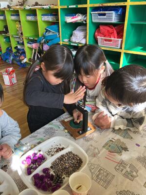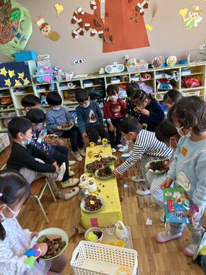 地域の"葉っぱ先生"こと、村松さんにお越しいただき、年中組を対象としたフクロウ作りをしました。 保護者ボランティアの方にもご協力いただき、目や羽などを自分で選び、ボンドを使って自分だけのフクロウを作っていきました。色々な表情のかわいらしいフクロウができ、子どもたちはとても嬉しそうでした! ナンキンハゼの葉で作ったフクロウ、葉っぱで作ったバッタを子どもたちにプレゼントしてくださったり、葉書の語源となったタラヨウの木の話や松ぼっくりの雄雌の話を聞かせてくださったりと普段では知ることができなかった素敵な自然の世界を知る機会となりました。 地域の方のご協力で、貴重な経験となりました。ありがとうございました。 葉っぱ先生こと、村松さん。木や花、虫、星など自然のことにお詳しいです。 保護者ボランティアさんにご協力いただいて、一緒に作りました。 みんな素敵なフクロウが出来上がりました♪ 自然物を使ってこんなに素敵なものができるなんて!