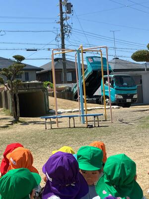 大きなトラックが園庭に!「何が運ばれてきたんだろう??」