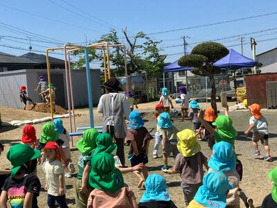 年少さんは2クラス合同で、年中長児は異年齢ペアをつくり、力を合わせたり、手伝ってもらったりしながら、一緒に活動することを楽しんでいました。