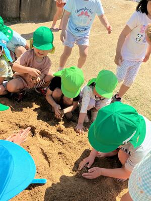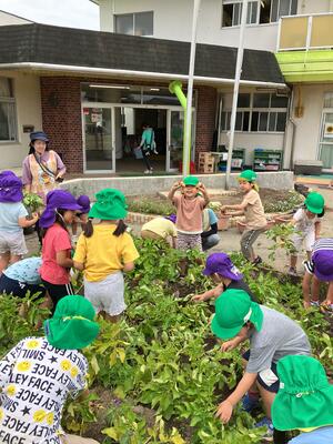 本日、北コミュニティーセンターのご厚意で、年中組が「どろんこ教室」の畑でじゃがいも掘りをさせていただきました。