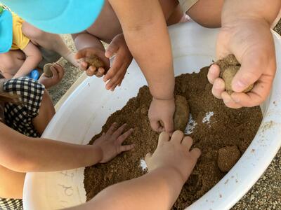 ふわふわの土に手足で触れて、歓声があがりました。これから泥の感触を味わって、たくさん遊んでいきたいと思います。