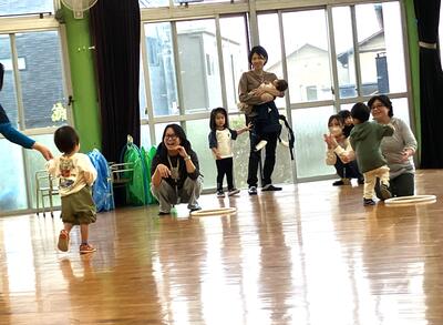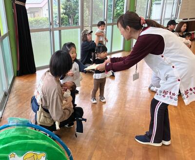 遊戯室では、かけっこに挑戦!! おうちの人に向かって、よ~いどんで走りました。元気なひよこクラブさんに、園長先生から絵本のごほうびも‼ 「ありがとう~🥰」のかわいい声にほっこりしました💛💛