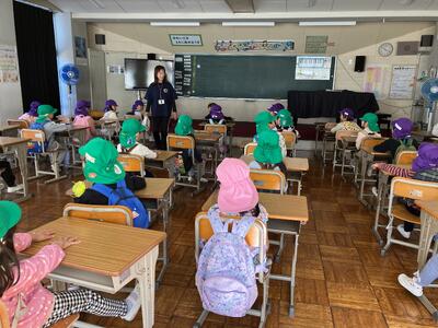 の合言葉をよく覚えていました。紙芝居や動画を見て、不審者への対応を一緒に考え、実際に声をかけられた時の対応を実践してみました。子どもたち自身も自分の身を自分で守る術を知り、意識をもっていくことが大切ですね。御家庭でも、近所にあるこども110番の家を把握しておく等、親子で話しておくといいですね。