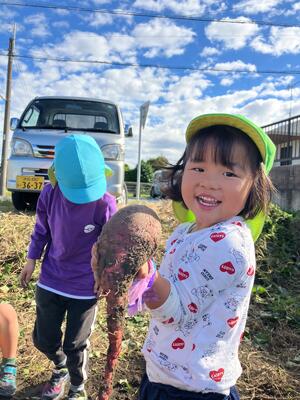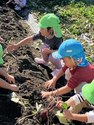 土の中から顔を出したサツマイモを見つけては夢中になって掘り、大きなサツマイモが出てくると、「見てー!こんなに大きい!」と大喜びしていました。みんなが掘ったサツマイモがカゴいっぱいになると、大満足の様子でした。