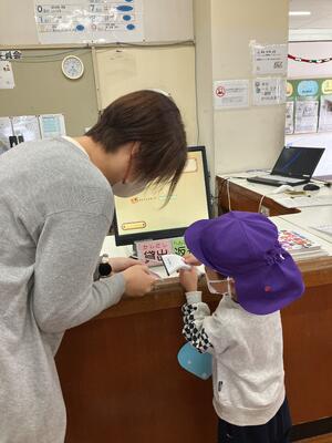 図書室では、職員の図書カードを使ったり、初めて使う貸出の機械にドキドキしたりしながら、嬉しそうに本を借りる姿がありました。